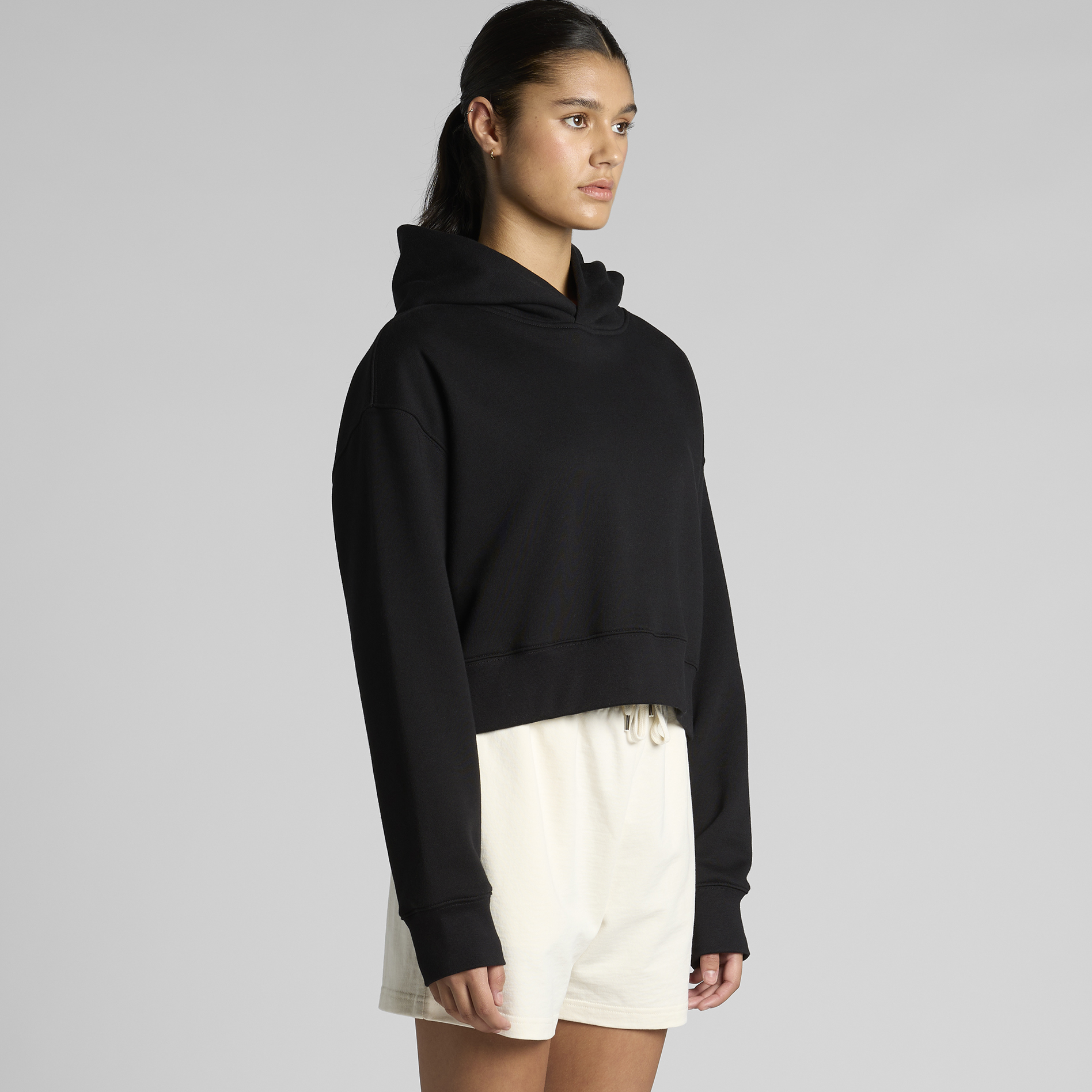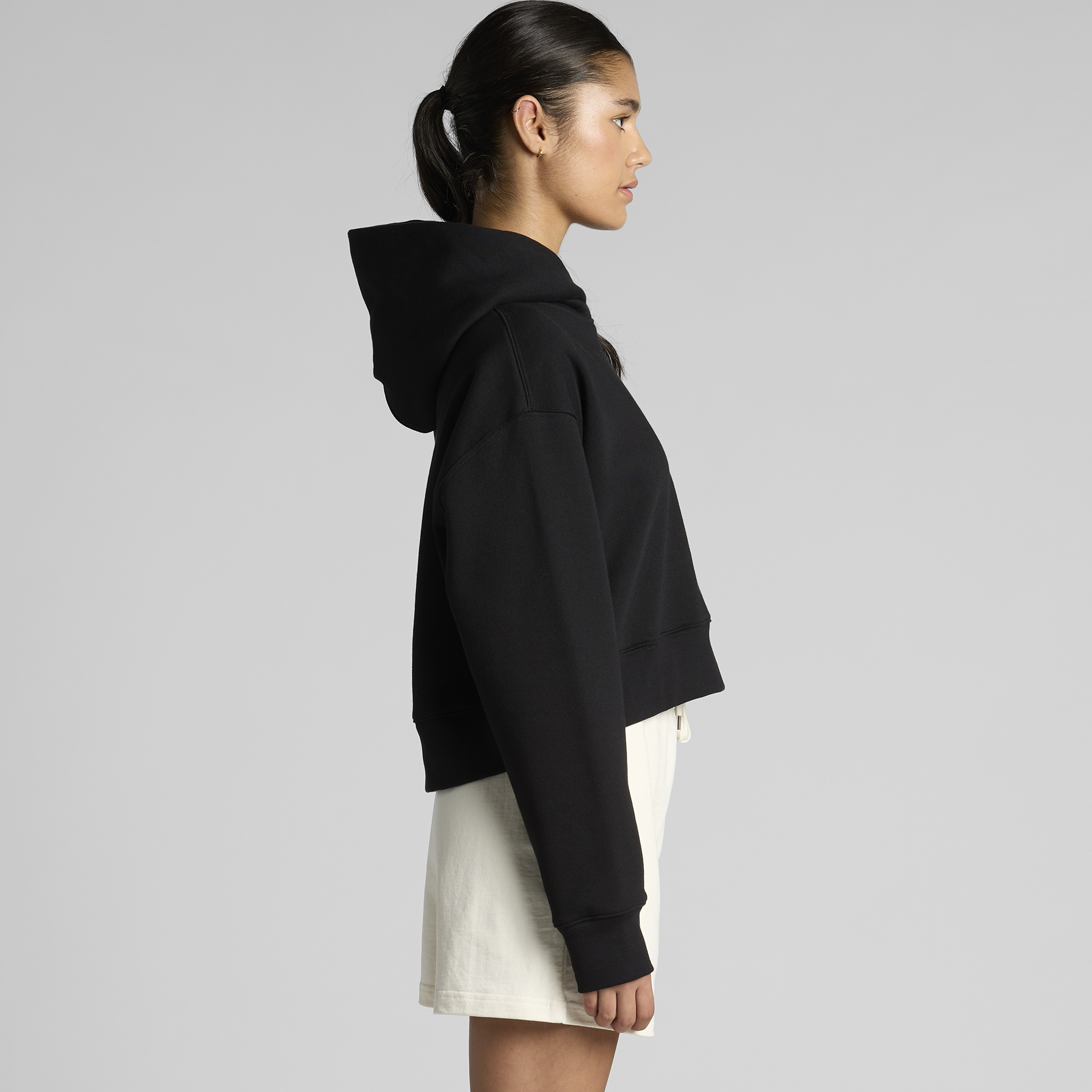 Pullover hood, drop shoulder, cropped full length, self-fabric lined hood, no drawcord, sleeve cuff ribbing