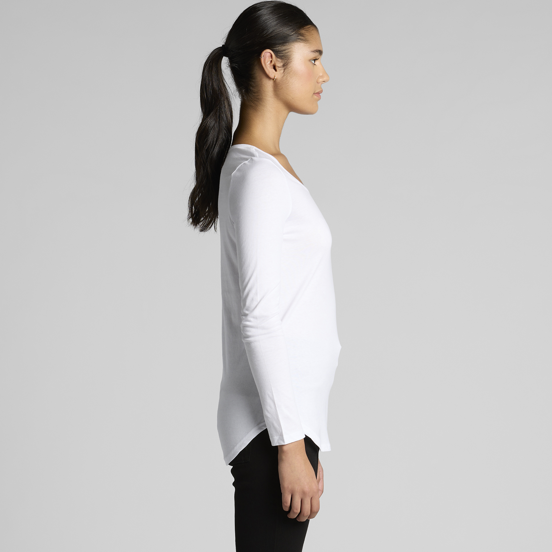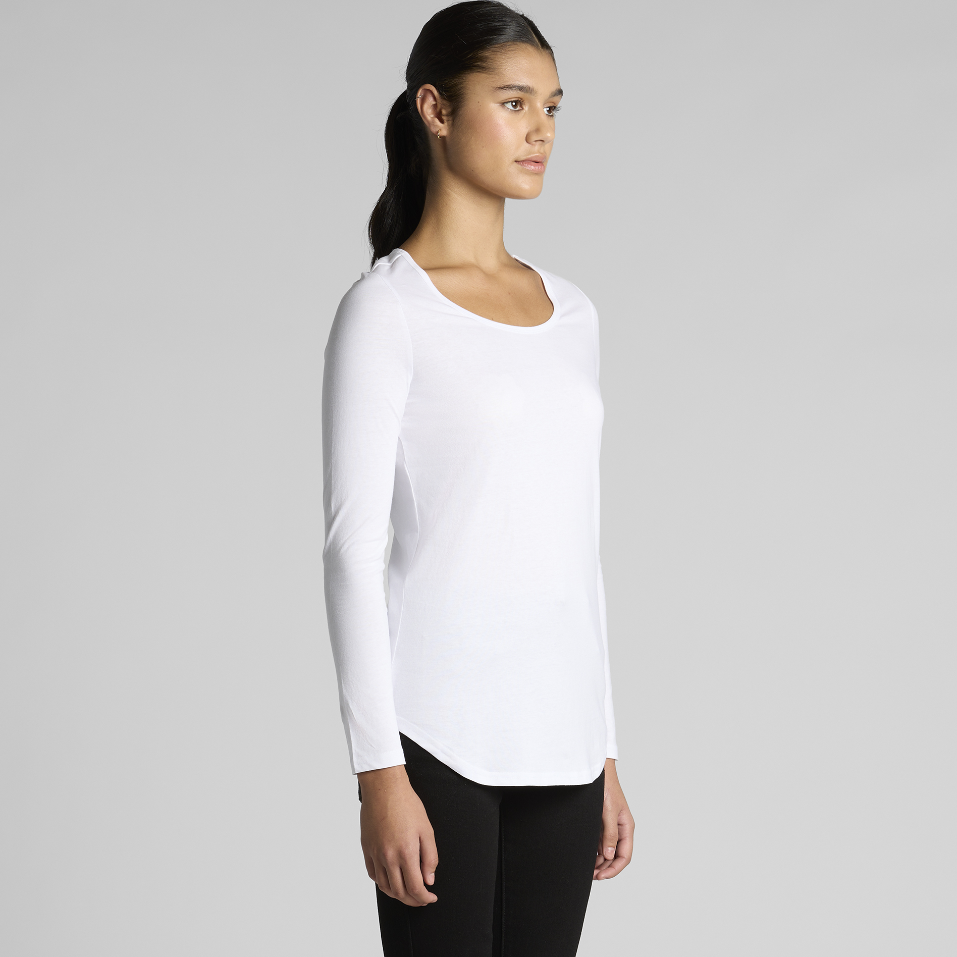 Scoop neck, curved hem, self-fabric binding on neck, side seamed, double needle hems, preshrunk to minimise shrinkage