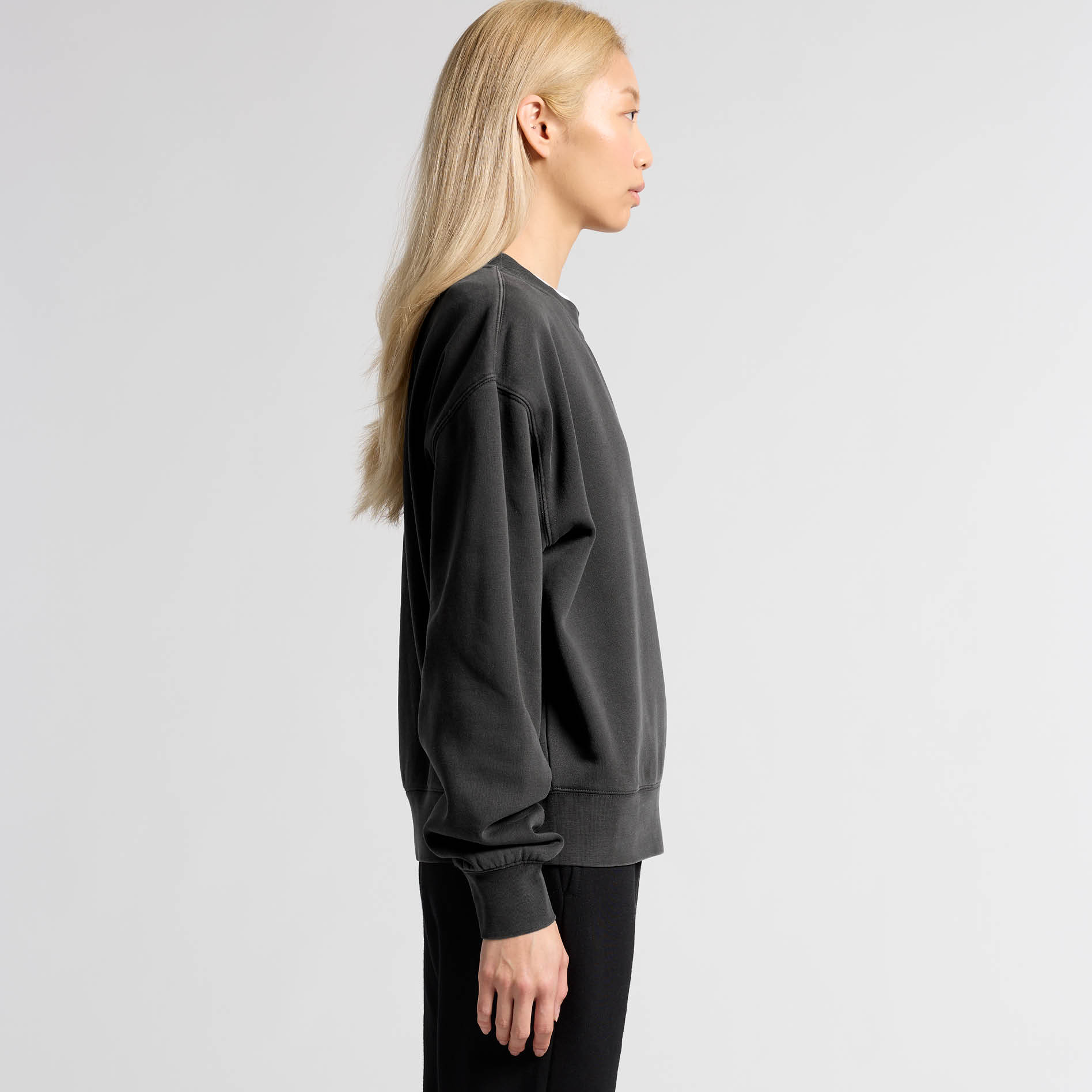 Pullover crew, drop shoulder, crew neck, garment dyed, sleeve cuff ribbing