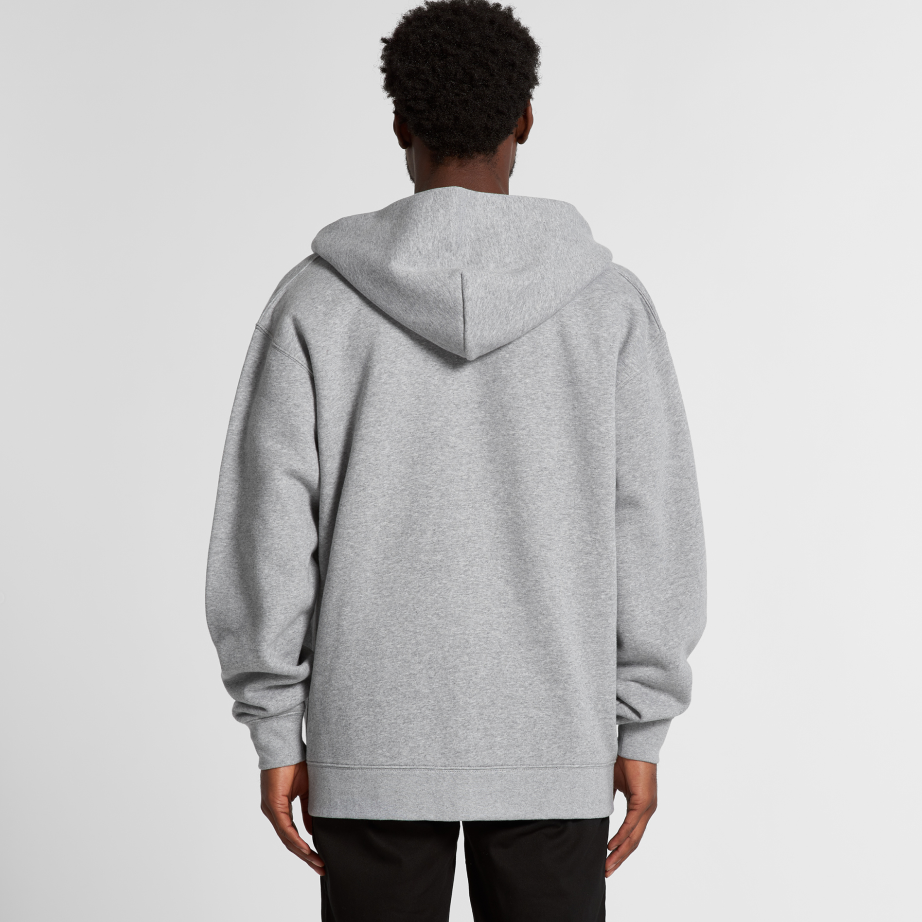 Zip hood, drop shoulder, kangaroo pocket, self-fabric lined hood, no drawcord, YKK zip, sleeve cuff ribbing