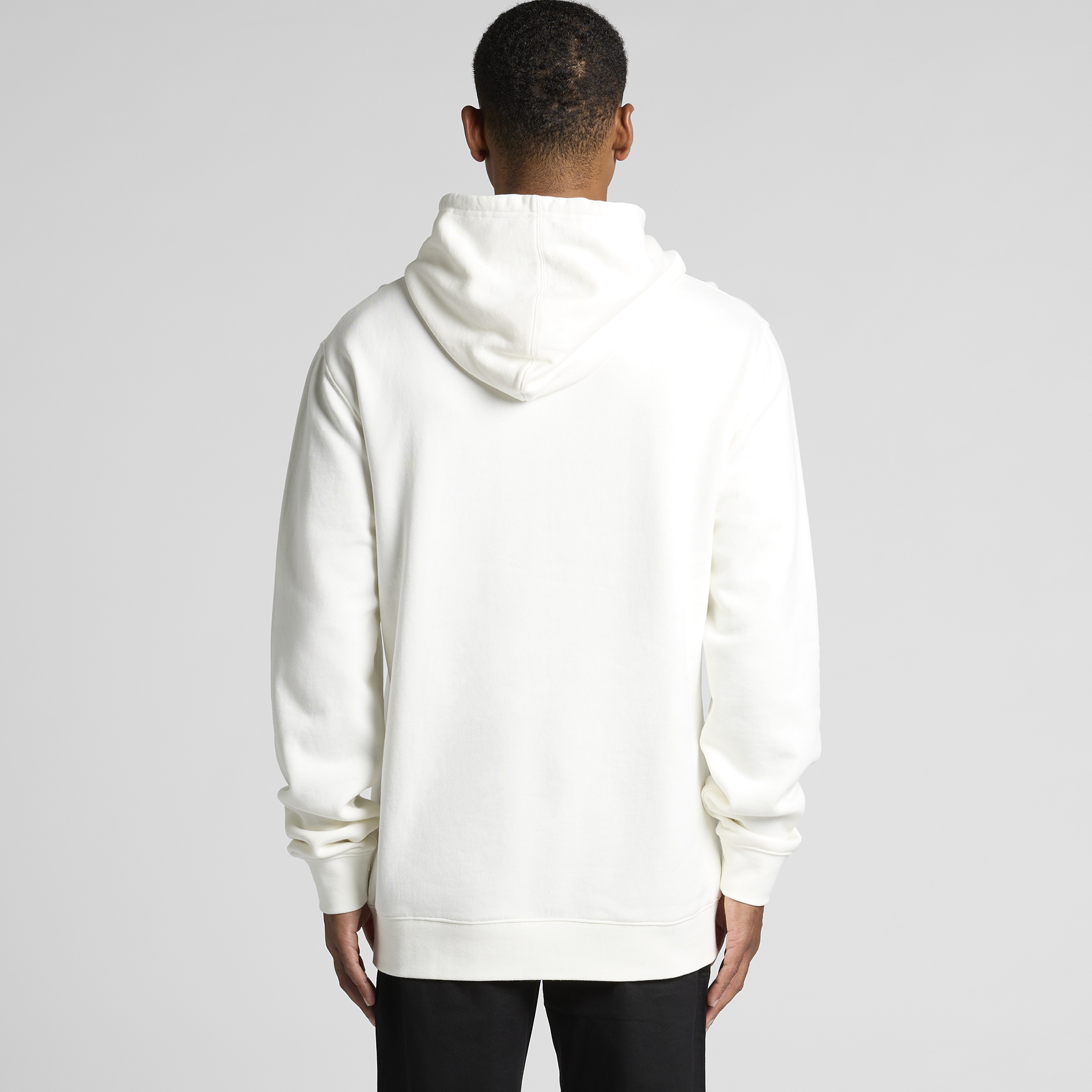Pullover hood, drop shoulder, kangaroo pocket, self-fabric lined hood, no drawcord, garment dyed, sleeve cuff ribbing